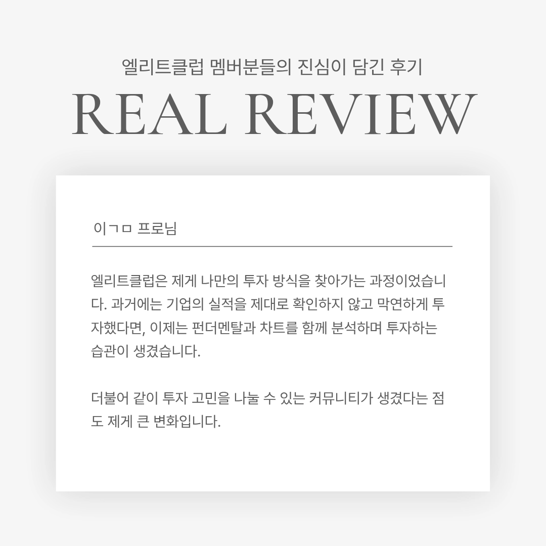 엘리트클럽에 참여한 실제 멤버분들이 남겨주신 솔직한 리뷰를 하나하나 확인해보시면, 엘리트클럽을 통해 달라질 여러분의 투자 여정이 생생히 그려지실 거예요.