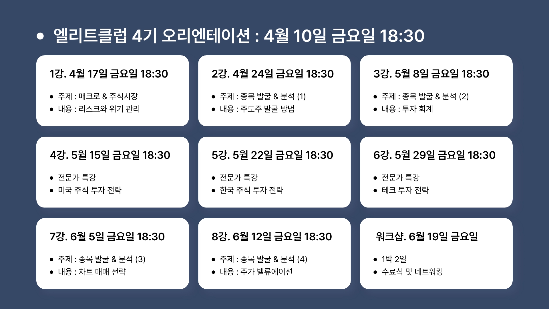 오직 36명에게만 허락된 9주의 여정 당신의 투자 인생을 완전히 바꿀 단 하나의 커뮤니티 ‘엘리트클럽’을 소개합니다.