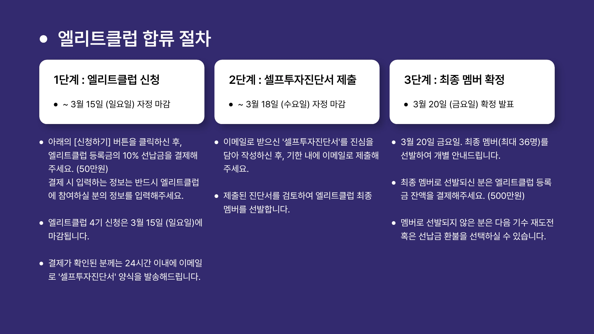 엘리트클럽 멤버로 합류를 결심하셨다면, 페이지 하단의 버튼을 통해 선납금 50만 원을 결제해 주세요. 이 선납금을 결제하신 분들만 4기 선발 심사 대상에 포함되며, 정원 36명이 채워지는 즉시 선발 절차는 조기 마감됩니다