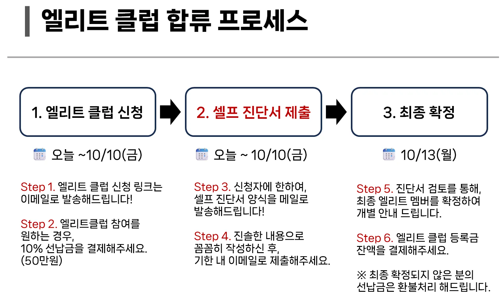 Step 4. ‘셀프 진단서’ 내용을 검토하여 최종 엘리트 클럽에 합류하실 수 있는 분을 선발하여 안내드립니다.