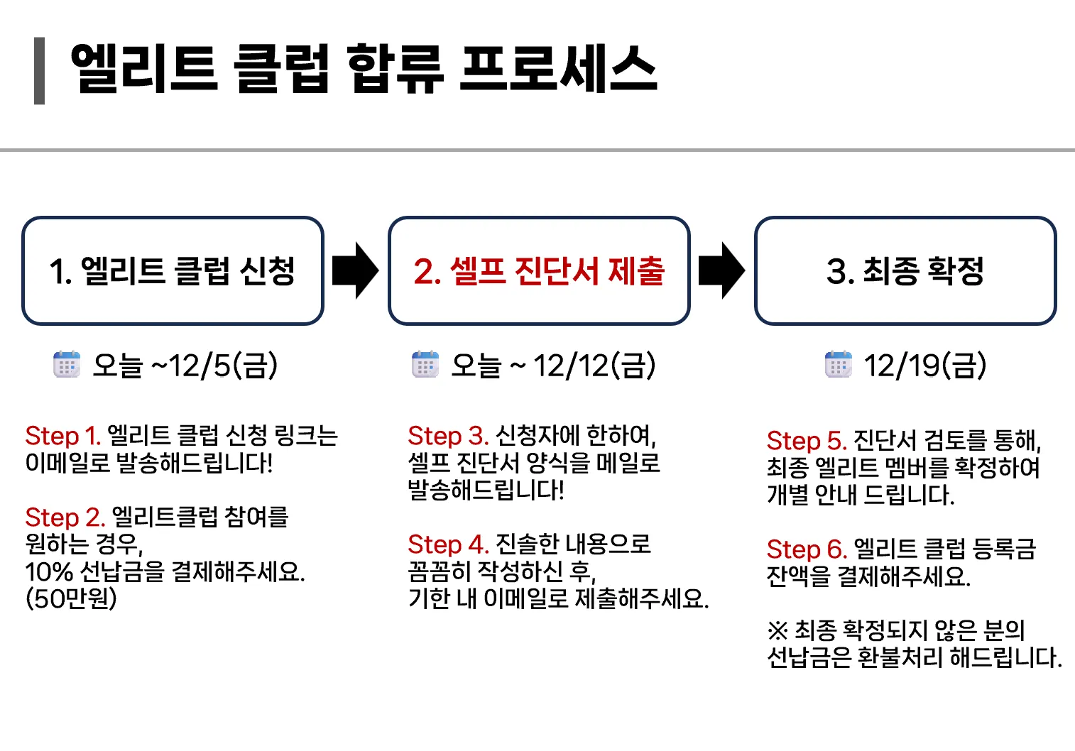 Step 4. ‘셀프 진단서’ 내용을 검토하여 최종 엘리트 클럽에 합류하실 수 있는 분을 선발하여 안내드립니다.